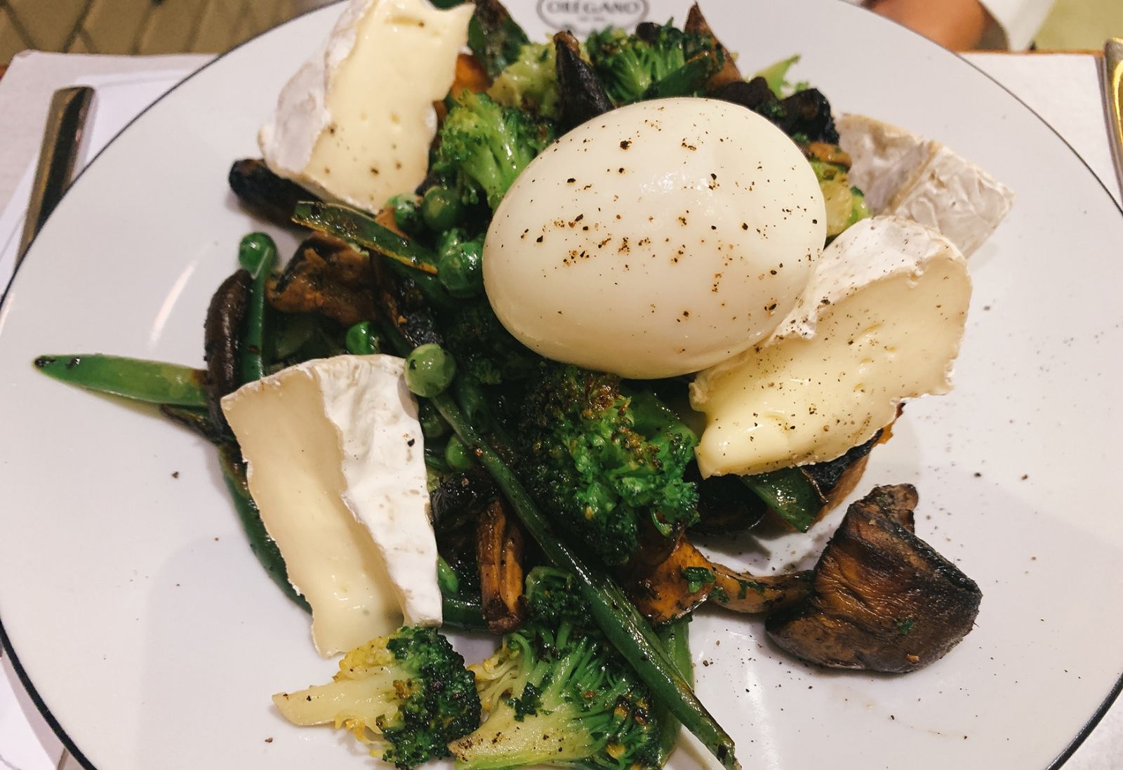 La otra entrada era una mezcla de hongos, brócoli, chauchas, arvejas, queso Camembert y un huevo mollet ($450*)