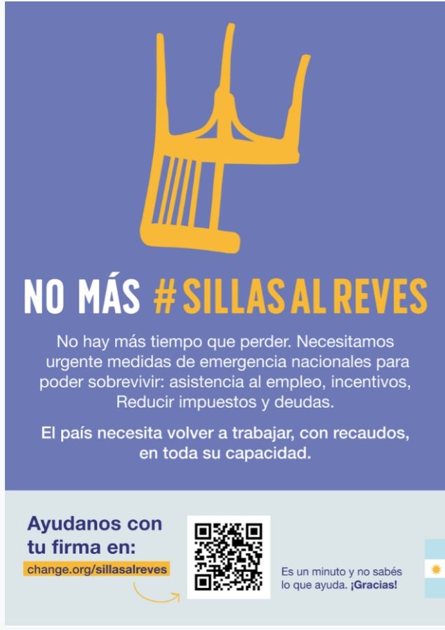 Entre el 19 y 21 de octubre se llevó a cabo en todo el país una fuerte campaña por redes sociales denominada #NoMásSillasAlRevés. Tuvo como objetivo demostrar una industria unida y que se solidariza con las diversas situaciones por las que está pasando en los diferentes puntos del país. Además de mostrarle a los gobiernos tanto nacional como provinciales, la delicada crisis que el sector atraviesa. Esta campaña fue iniciada por un grupo de gastronómicos autoconvocados en las 23 provincias argentinas y la Ciudad Autónoma de Buenos Aires, sin involucrar ideologías políticas. Su eje principal es la unión y la federalización. Se invitó a todos a unirse a la causa firmando en Change.org/sillasalreves. ¿Qué solicitan los empresarios gastronómicos mendocinos? Horario de atención hasta la 01:00 horas, extensión de los ATP hasta fin de restricción del 50%, rebajas impositivas 2020, IVA del 10,5%.
