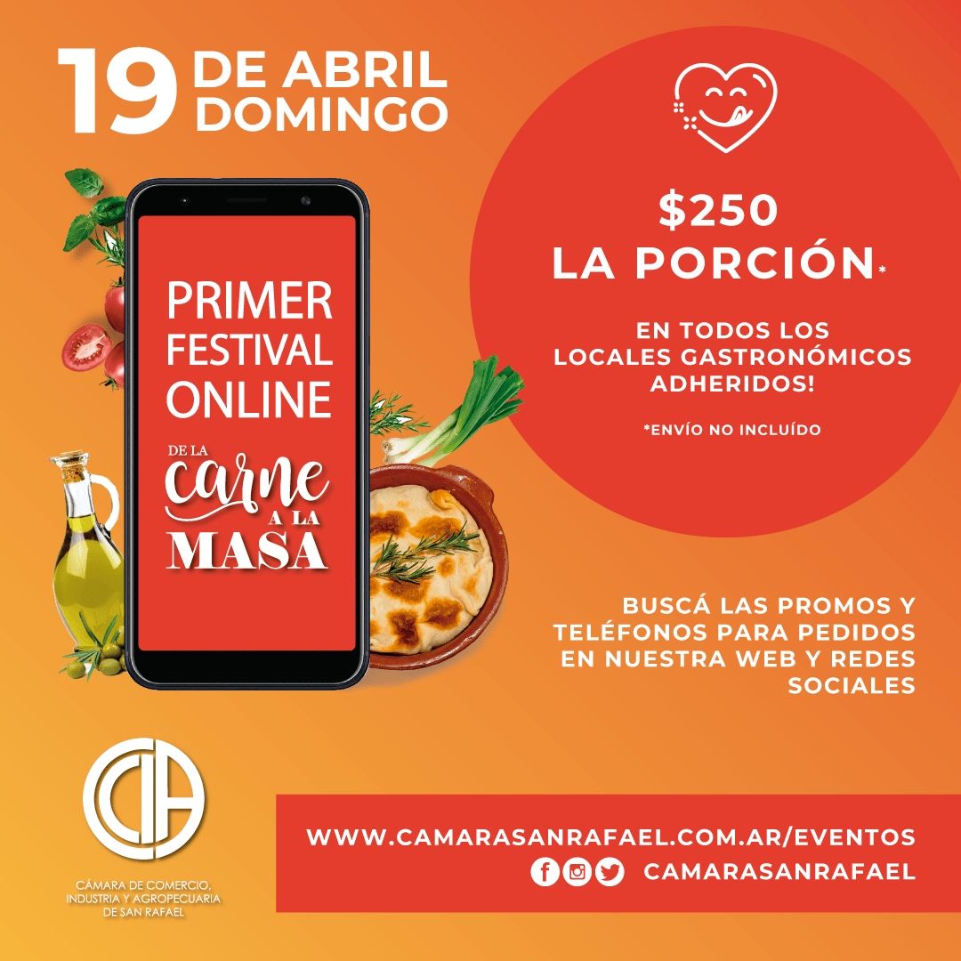 Hasta ahora si hablábamos de un festival gastronómico, jamás hubiera pasado por nuestra mente que se llevara a cabo o se concretara en los hogares de los consumidores. Pues bien, en an Rafael tuvieron la idea de trasladar la experiencia de saborear el plato típico "carne a la masa" a las casas a través del delivery. De esta manera se respeta el aislamiento social, se activa la industria gastronómica, y se le da la posibilidad al público de pasar un momento diferente y placentero sin tener que moverse de sus domicilios. Este plato emblemático, la Carne a la Masa, es patrimonio gastronómico del departamento.