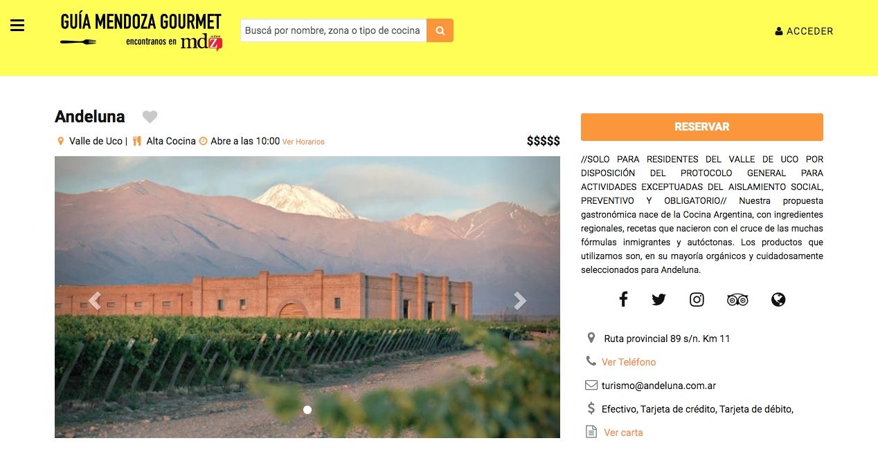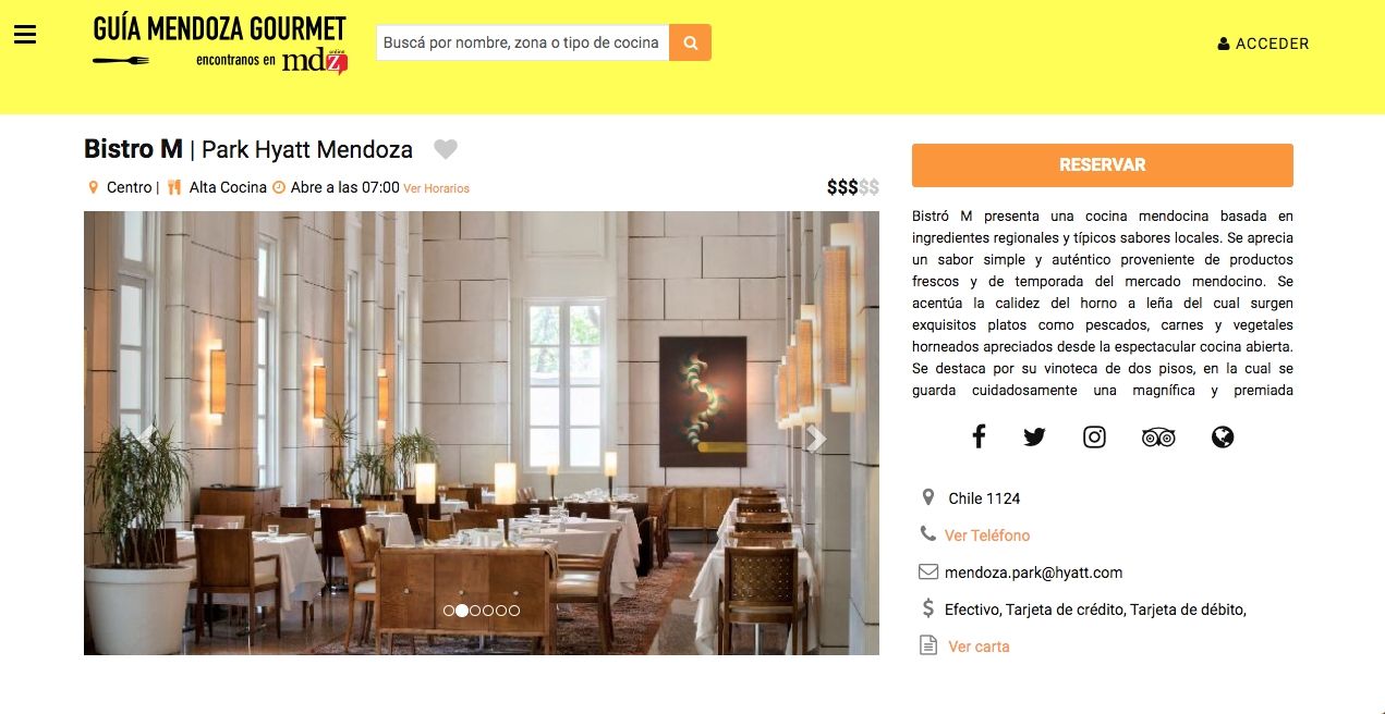 1. Se deben hacer reservas previs por teléfono o de manera online. Puede usarse la web o app de Guía Mendoza Gourmet.. Guía Mendoza Gourmet. Podés bajar la App en este link para iOS y en este para Android.