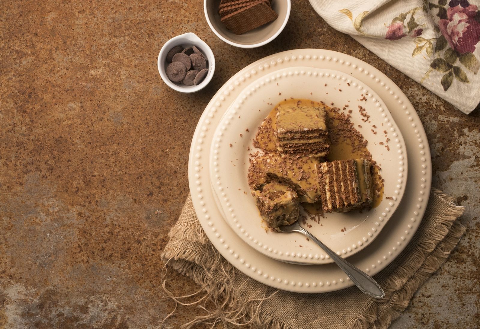 Podés ver en esta toma de chocotorta que, gracias al estilismo, hay dinamismo, un pedazo de torta ha sido cortada por una cuchara, hay salsa de dulce de leche derramada, junto con el chocolate rallado que quedo como salto del rallador.