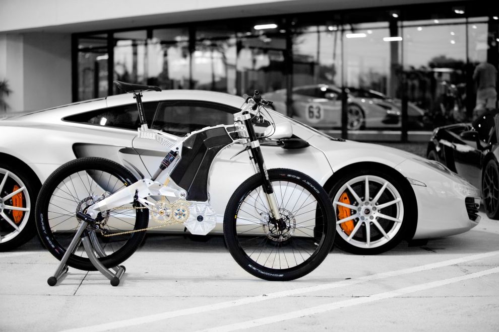 Esta exclusiva E-Bikede M55 combina una estética extremadamente futurista con un rendimiento excepcional, gracias a su doble suspensión (con horquilla invertida incluida), su gama de motores eléctricos de 250W a 2.000W o sus interesantes características (buje Rohloff de 14 velocidades, frenos Hope con discos flotantes de 203 milímetros, componentes de KCNC o el sistema integrado de iluminación LED Supernova, entre otras).
