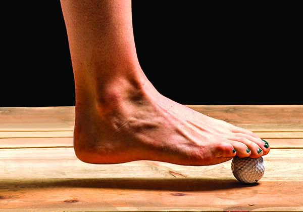 Sentada en una silla coloca una pelota de golf o similar bajo el pie derecho. Hace rodar la pelota por todo el pie. Hacelo de forma suave, verás que te proporciona una sensación agradable. Luego trata de mover el pie de arriba a bajo y haciendo círculos para aumentar la eficacia del masaje.