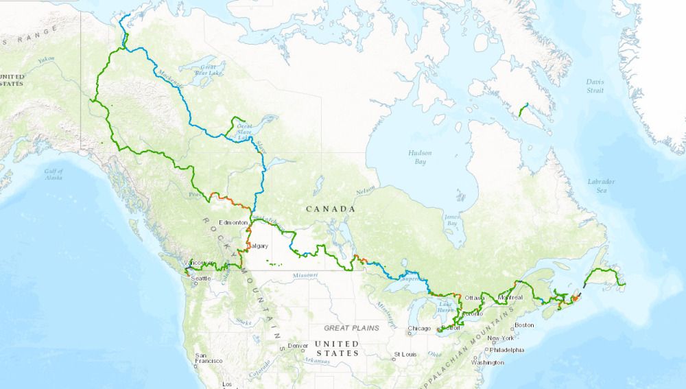 Nos podemos imaginar lo ambicioso del proyecto si tenemos en cuenta que Canadá es el segundo país más grande del mundo, después de Rusia, aunque cuenta con menos habitantes que España (algo más de 35 millones, según datos de 2013) ya que el camino se desarrolla desde Vancouver a Montreal, pasando por alguna de las zonas más remotas, como los territorios del Noroeste llegando incluso a las islas de Terranova y Labrador.