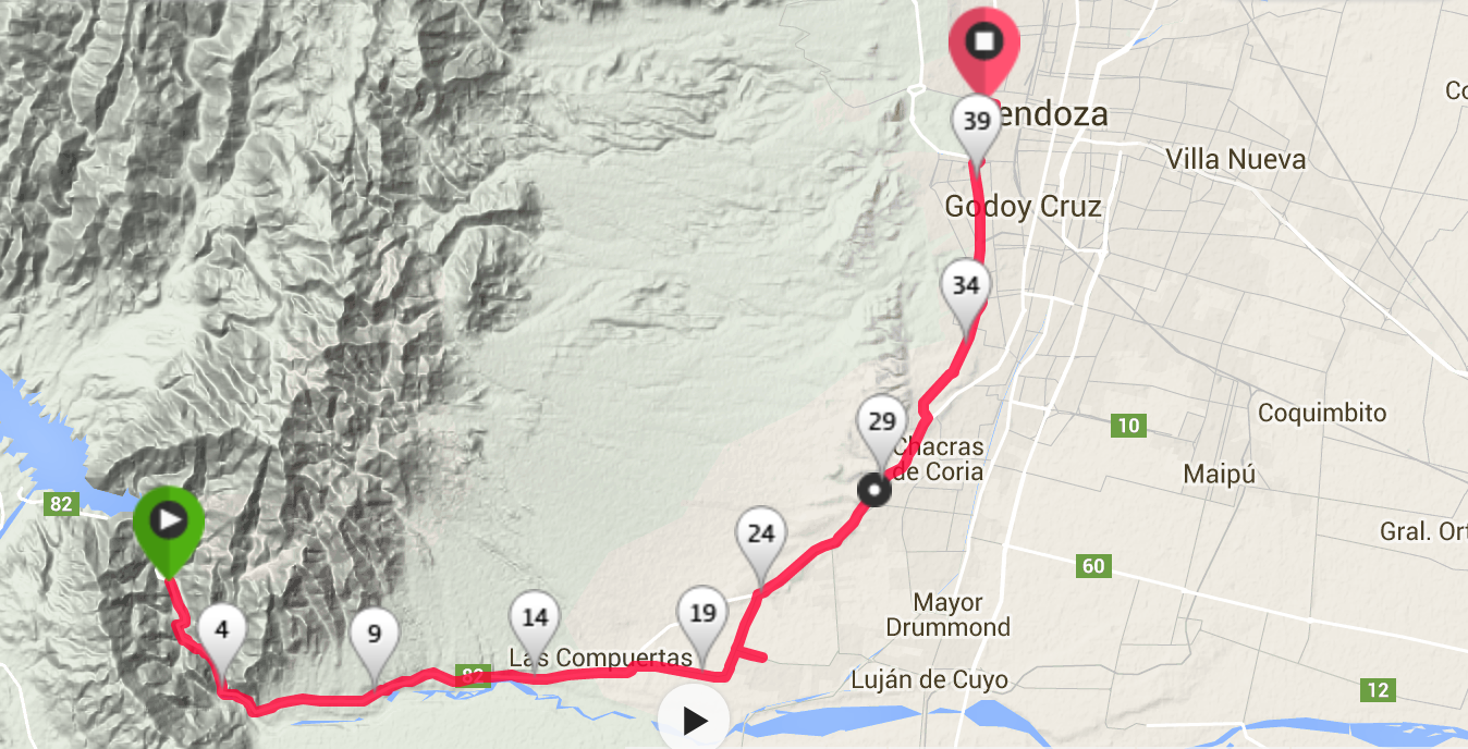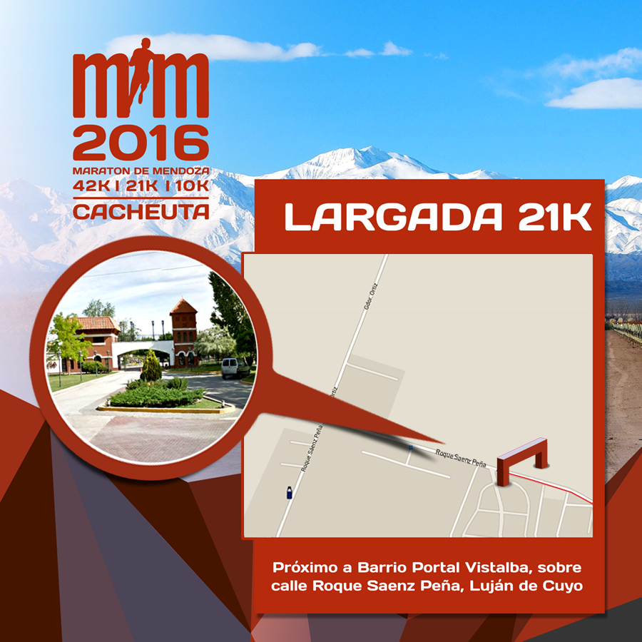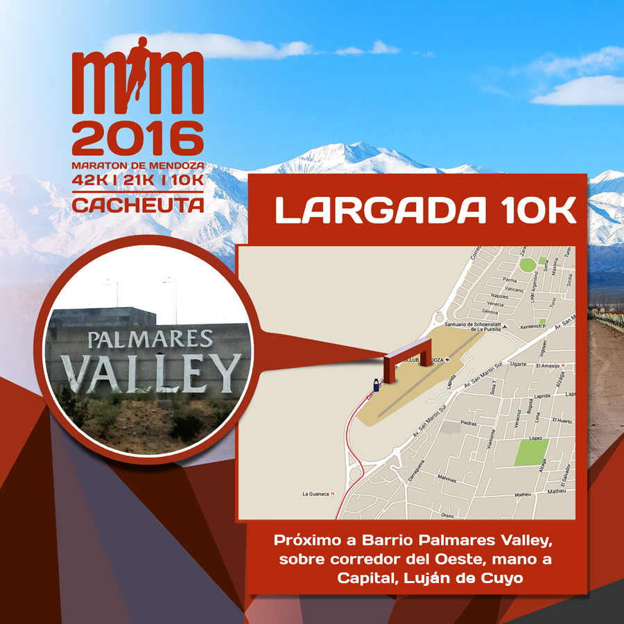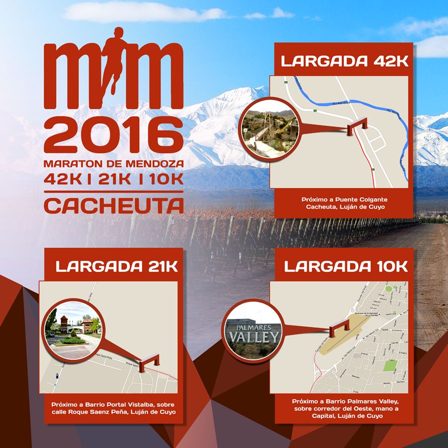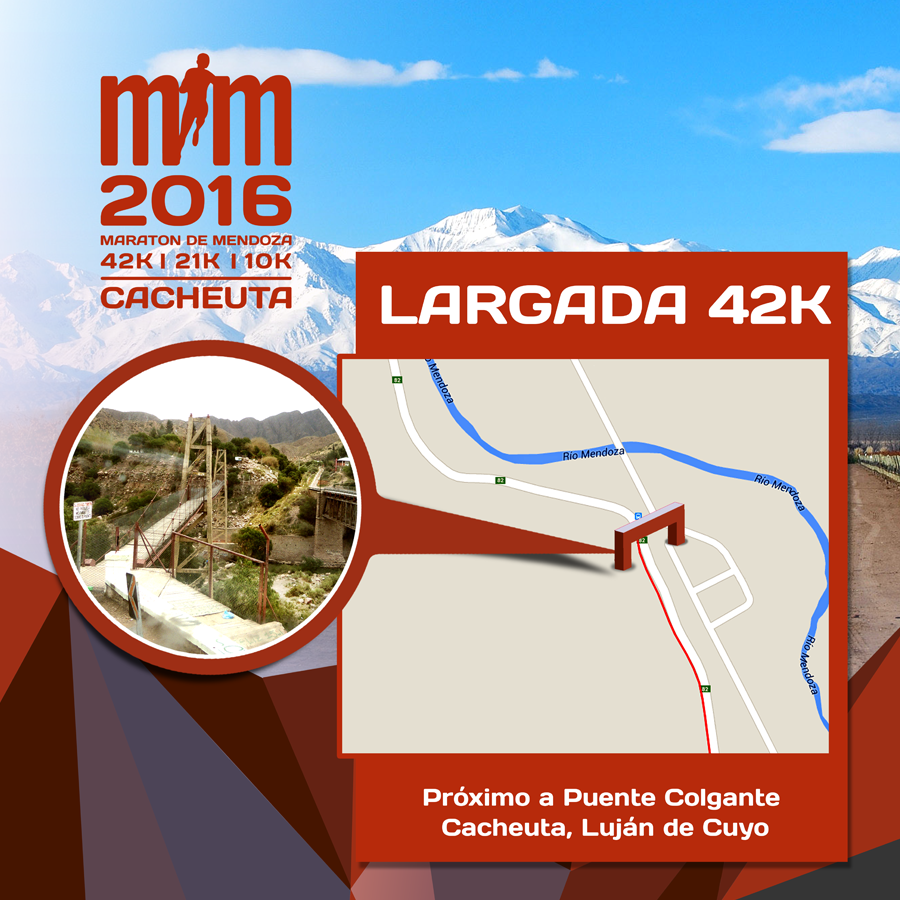 La largada de la Maratón es del Puente Colgante en Cacheuta y la llegada en los Portones del Parque General San Martín.