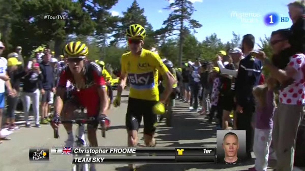 Casi en la meta del Mont Ventoux, un accidente inesperado de una moto derivó en la caída de Froome que afectó su liderazgo en la carrera.