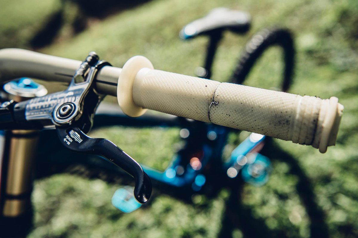 Toques personales: Puños Renthal de kevlar fijados con pegamento azul y alambre.