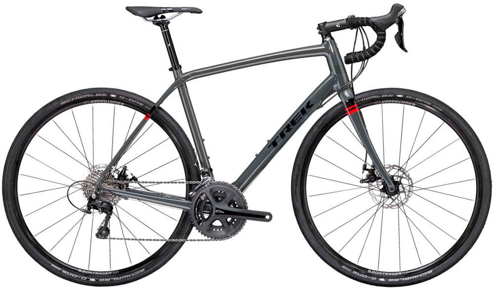 Con cuadro de aluminio Alpha Serie 200, rótula IsoSpeed, transmisión Shimano 105 de 2x11 velocidades, frenos mecánicos de disco TEKTRO Spyre, ruedas Bontrager TR Disc y neumáticos Schwalbe G-One Allround 700x35c. Peso declarado de 9.63 kilogramos (talla 56) y precio recomendado de u$s 1.900 .