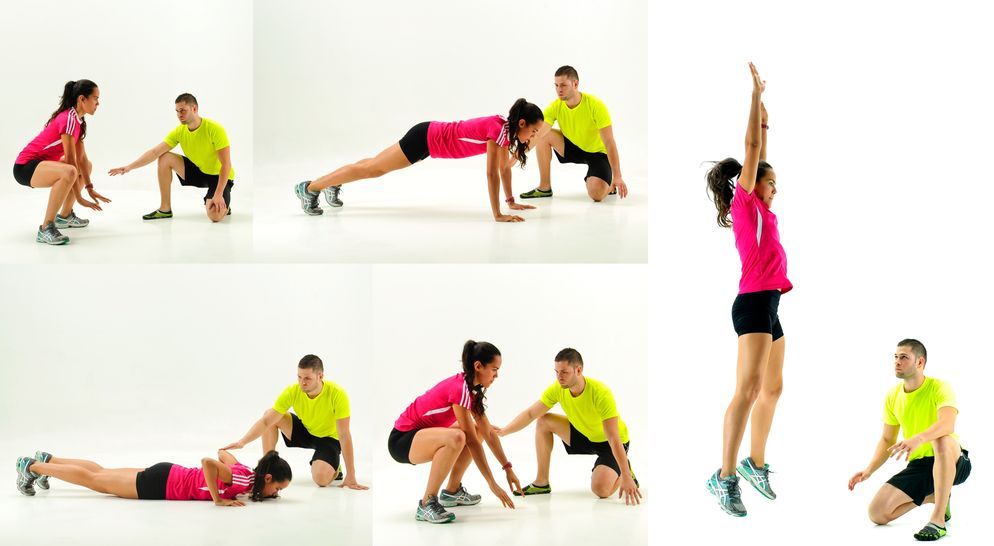 Acondicionamiento calisténico, se trata de una secuencia de movimientos rápidos que combina sentadillas, flexiones y salto vertical. La técnica se inicia de pie, luego se pasa a estar en posición de cuclillas con las manos siempre en el suelo, y posteriormente a saltar llevando las piernas hasta atrás. Acto seguido, repetir el movimiento.