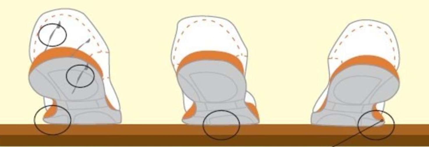 Colocar las zapatillas sobre una mesa e ir verificando sus desequilibrios, como las áreas gastadas o las roturas de un único lado.