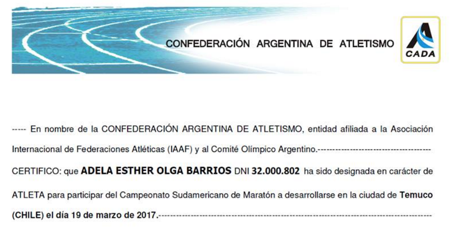 CADA (Confederación Argentina de Atletismo) le comunicó a Adela Barrios, que formará parte del Seleccionado Argentino de Atletismo que participará el próximo 19 de Marzo en el Campeonato Sudamericano de Maratón en la ciudad de Temuco, Chile y el 18 de marzo en Montevideo, Uruguay.