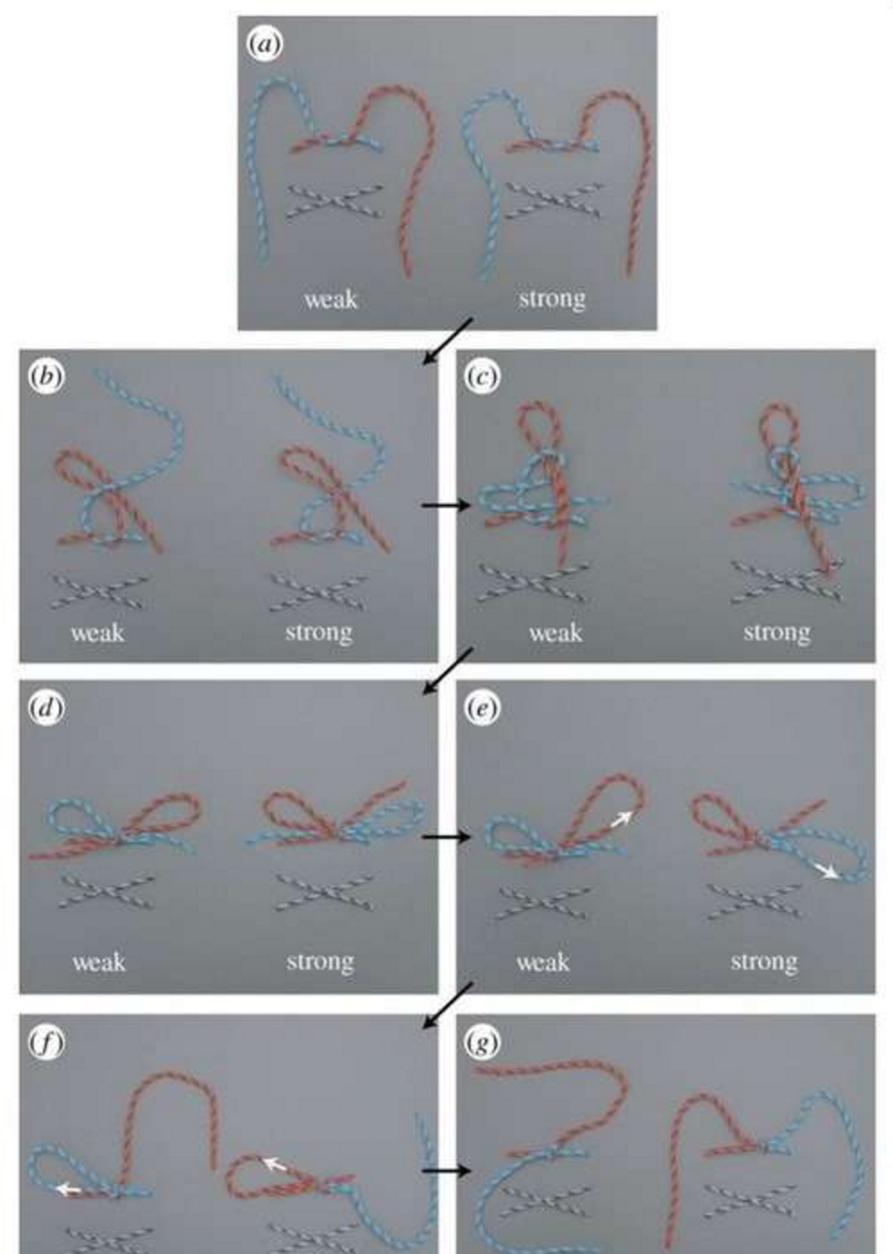 "Estamos tratando de entender los nudos desde una perspectiva mecánica, esto es, por qué se puede tomar dos hilos y conectarlos de una manera que resulte muy fuerte, pero otra forma de conectarlos resulta muy débil", dijo Oliver O'Reilly, profesor de Berkeley de ingeniería mecánica, cuyo laboratorio llevó a cabo la investigación. "Hemos podido demostrar que el nudo débil fallará siempre y el nudo fuerte fallará en una escala de tiempo determinada, pero todavía no entendemos por qué hay una diferencia mecánica fundamental entre esos dos nudos".