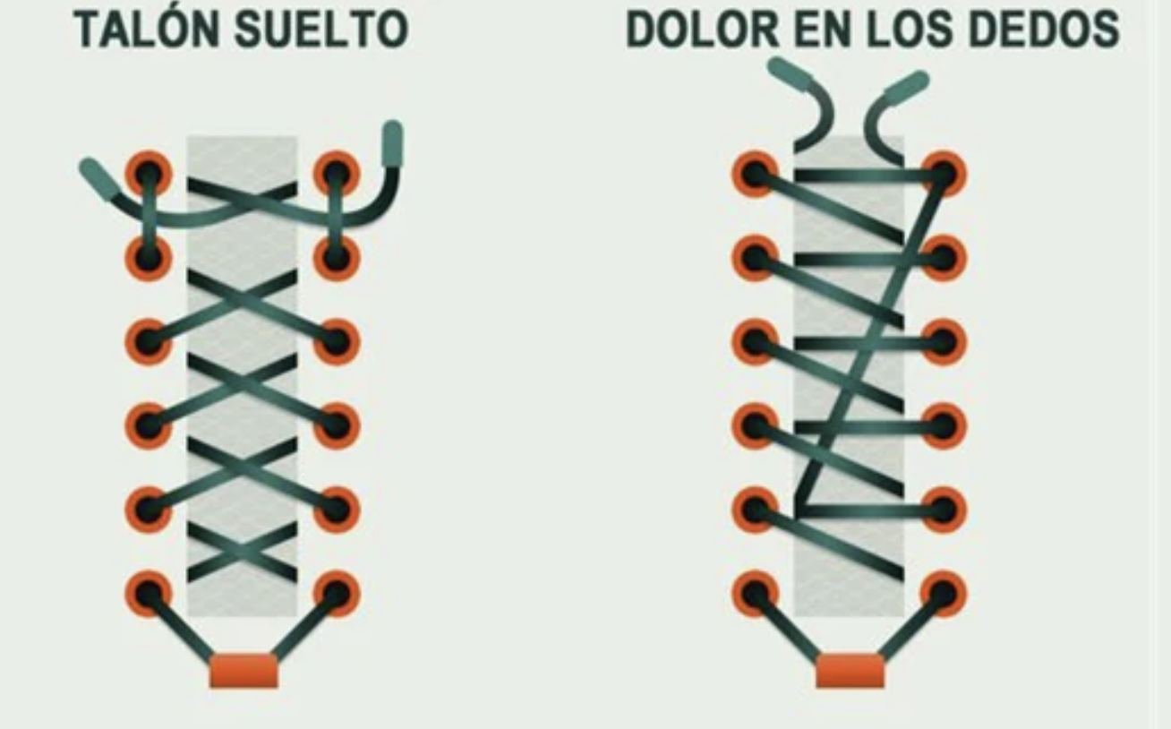 La primera imagen ejemplifica un modelo para cuando la zapatilla "baila". Ofrece un encaje más compacto y mantiene el talón en su lugar, evitando la aparición de posibles dolores y ampollas. Otra opción de lazado para el talón suelto es utilizar los agujeros extras que traen las zapatillas de running en la parte alta.