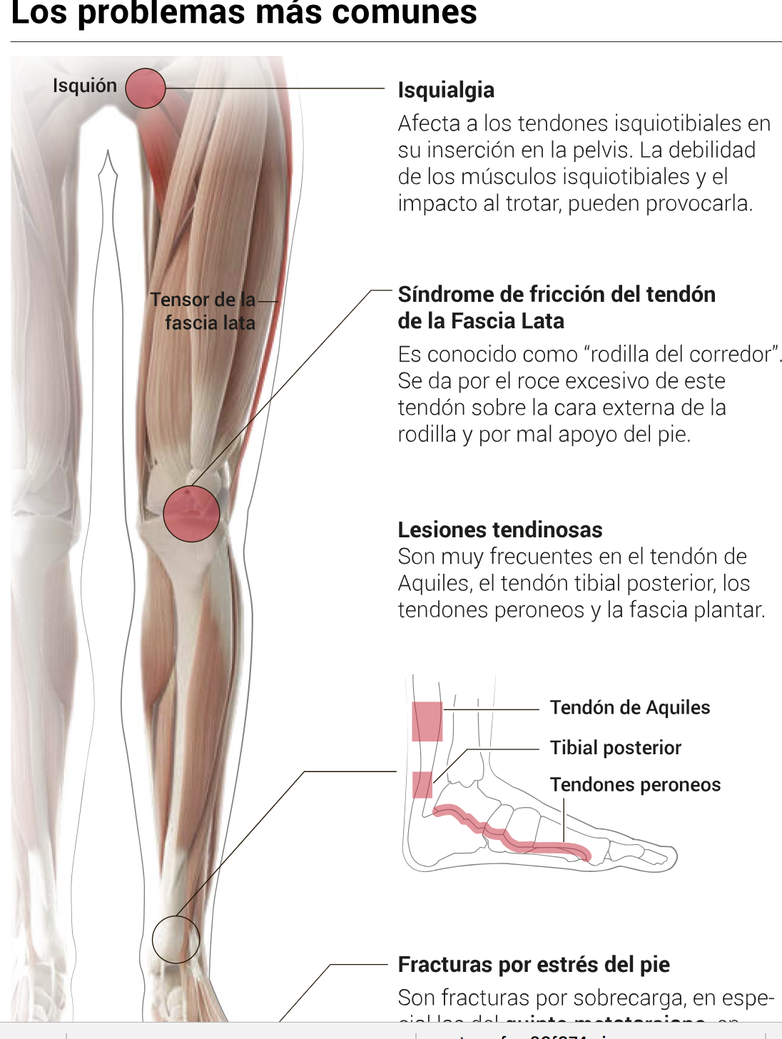 Otras lesiones que suelen verse son las fracturas por estrés del pie. La isquialgia, dice Torrengo, es otra lesión frecuente. Se trata de una tendinopatía de los isquiotibiales en su inserción en la pelvis (isquion) y que se da cuando hay una debilidad muscular de los isquiotibiales sumado al impacto del trote. La rodilla es otra zona plausible de lesiones. Una frecuente es la llamada "rodilla del corredor" que se da por el roce excesivo del tendón de Fascia Lata sobre la cara externa de la rodilla.
