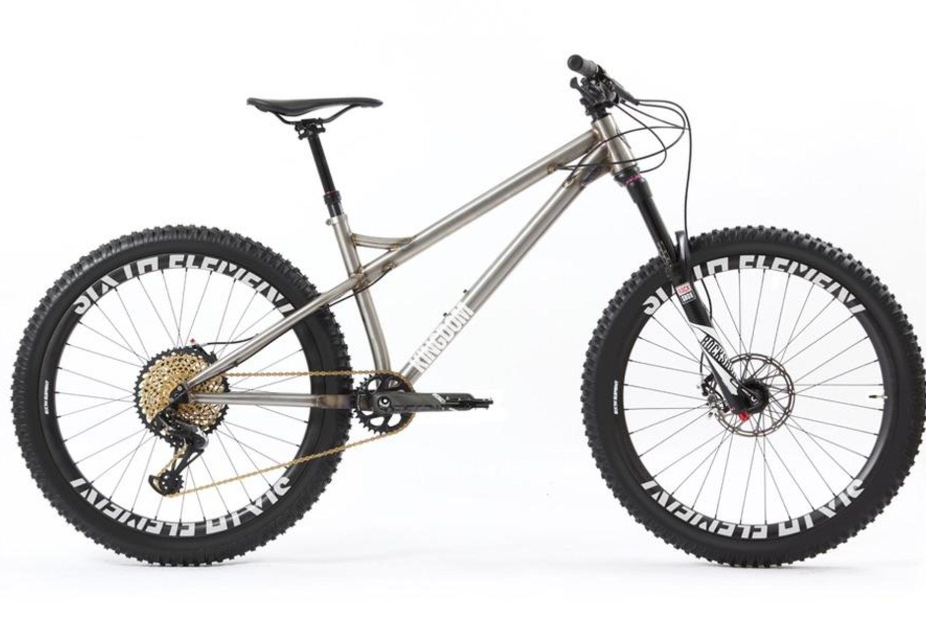 La Kingdom Vendetta LS tiene un ángulo de dirección de 64,5° y la capacidad de soportar horquillas de hasta 160 mm, lo que la convierte en una de las bicicletas más ligeras de esta gama. También puede llevar neumáticos de 27,5" y 29" de hasta 2,8" de ancho, por lo que estamos ante una auténtica hardtail hardcore. El armazón de titanio pesa tan sólo 1,8 kg y está disponible en bruto o pulido. ¿A quién no le gusta el titanio bruto?