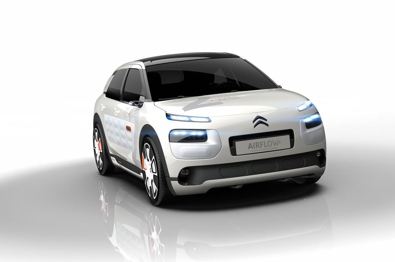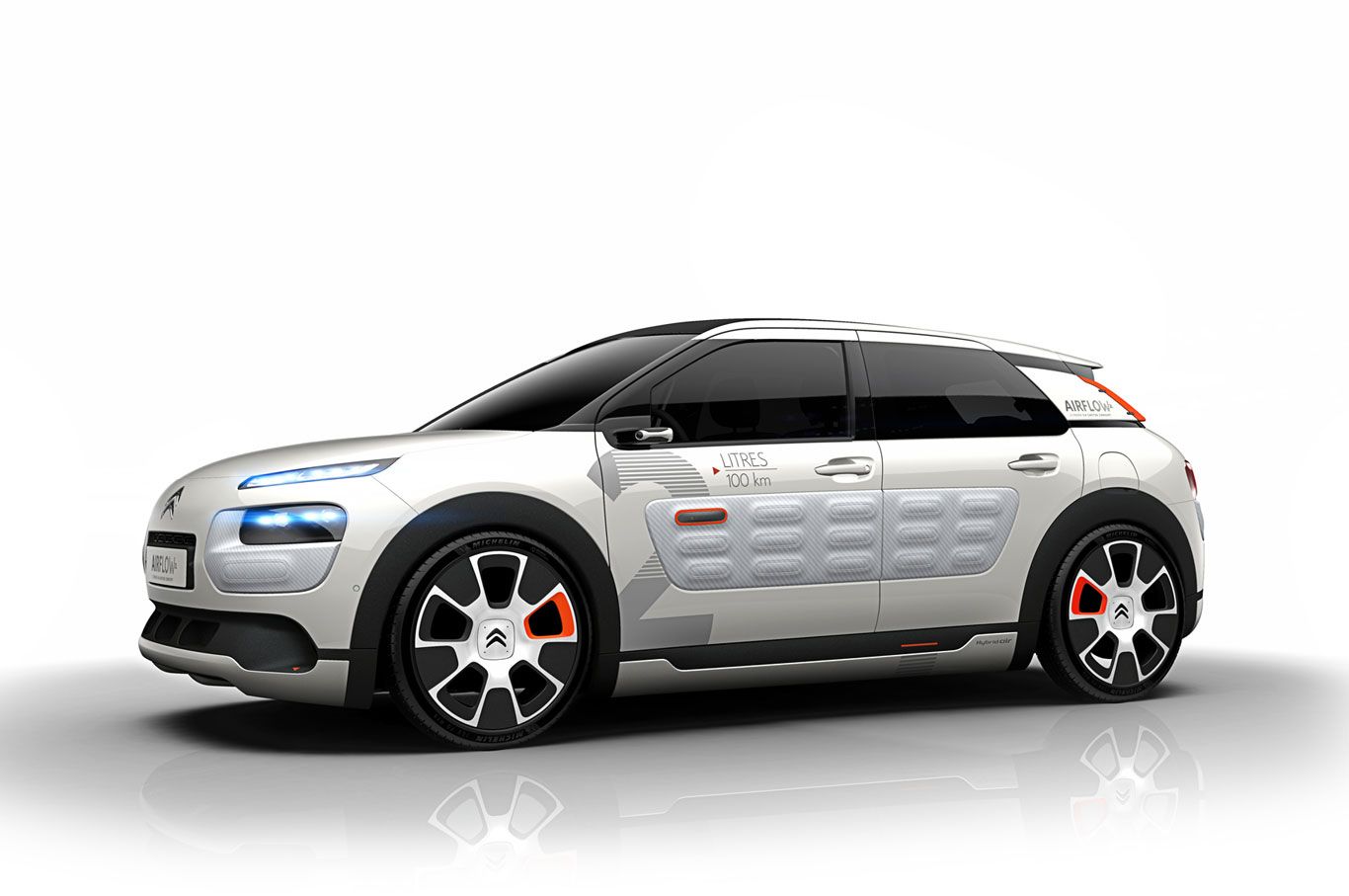 C4 CACTUS AIRFLOW 2L. Este prototipo está equipado con tecnología Hybrid Air y sólo consume 2lts/100 Km. Si el C4 Cactus de serie es ya 200 kg más ligero que el Citroën C4, el concept C4 Cactus Airflow 2L logra un ahorro adicional de 100 kilos (cadena de tracción incluida), lo que se traduce en una disminución del peso del vehículo de un 11%.