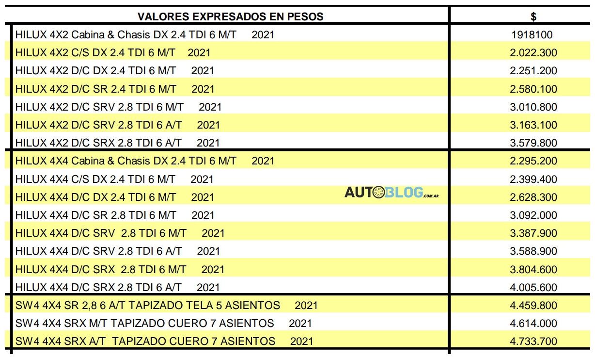 Los valores de estos Model Year 2021 fueron publicados en la web de Toyota Argentina y replicados por el mencionado Autoblog. De manera específica, en la sección Financial Services, que ofrece comprar vehículos mediante leasing o crédito prendario.