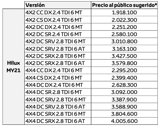 Todas estas características se incorporan a las prestaciones ya conocidas del modelo, además de destacarse por la calidad, confiabilidad y durabilidad propias de un Toyota, destacó la marca en el comunicado oficial.