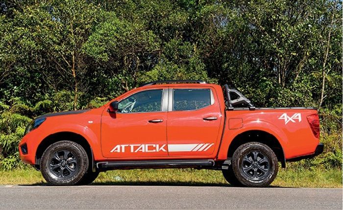 La Attack viene de serie con llantas de 16 pulgadas con neumáticos Bridgestone Dueler A/T, barra sobre la caja de carga y stickers, sobre el capot y los laterales.