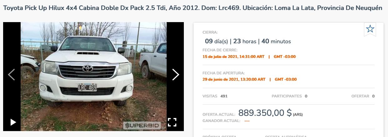 El 15 de julio, en tanto, concluirán las subastas de la compañía ESUCO, que remata por Narvaezbid 10 lotes en los que 8 corresponden a pick ups Toyota Hilux y Chevrolet S10. Las ofertas arrancan desde 456.000 pesos (S10 STD 2.8 Cabina Doble 4x4, modelo 2008) y desde 907.000 pesos (Hilux 2.5 Cabina Simple 4x2, año 2011).