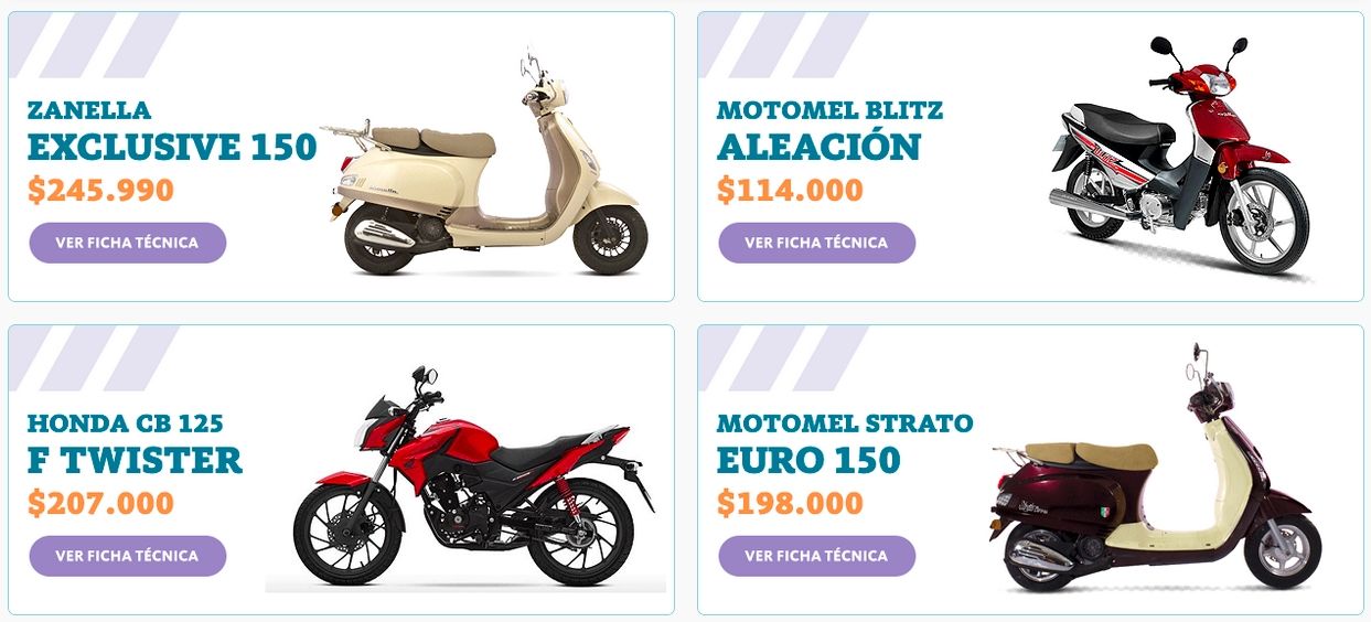 En total pueden comprarse 50 modelos, seis más respecto a la edición anterior, fabricados en el país por 14 marcas, entre otras Motomel, Corven, Honda, Guerrero, Zanella y Mondial. Los valores arrancan en 97.000 pesos y ascienden hasta los 249.000 pesos.