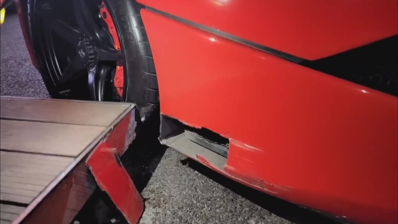 Siendo el modelo del cavallino rampante un deportivo con muy poco despeje, la parte de la moldura impactó con la plataforma y quedó atascado. Al darse cuenta de esto el influencer tomó la desacertada decisión de acelerar, lo que hizo que todo empeorara aún más. Finalmente, el faldón de la puerta del acompañante fue arrancado.