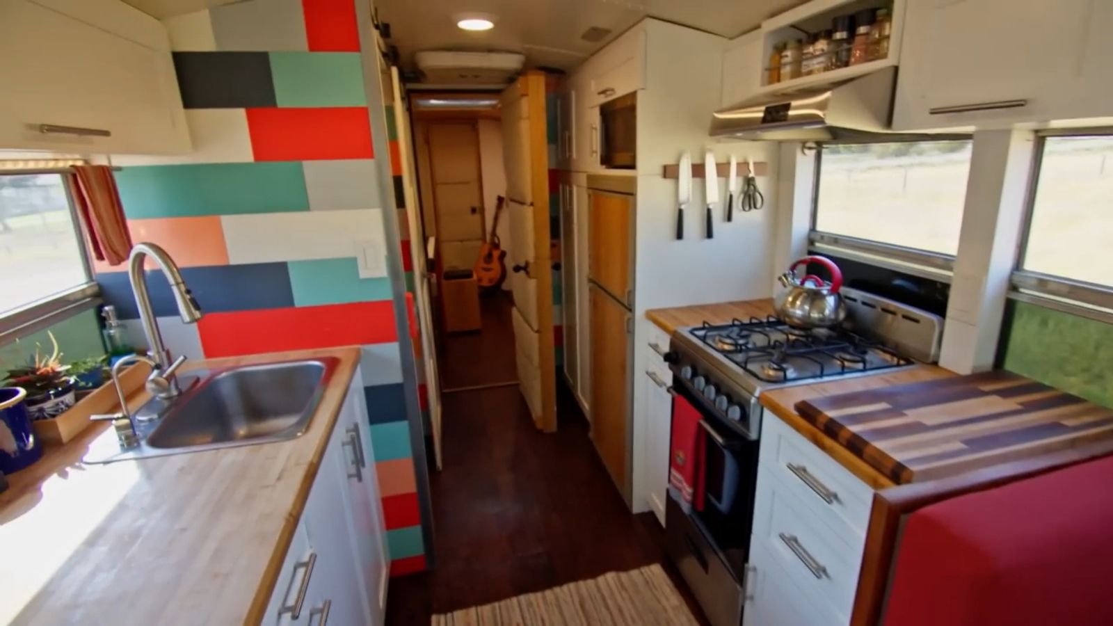 En el interior, podemos observar un sofá, cocina, microondas, un horno, sillas y alacenas propias de cualquier otro RV común y corriente. Pero claro, estamos hablando de un “skoolie”.