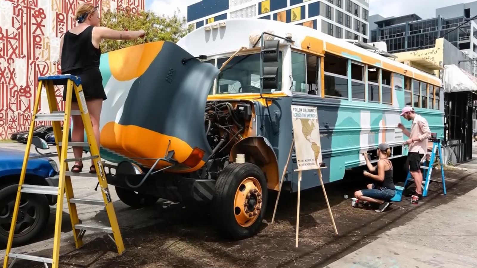 A simple vista, puede ser que llame la atención su aspecto principalmente por los colores que ilustran este particular vehículo, convirtiéndolo en un mural andante. En la parte superior, mediante una escalera podemos subir a una terraza con diez paneles solares y un receptor del satélite StarLink qué permite obtener señal WiFi.