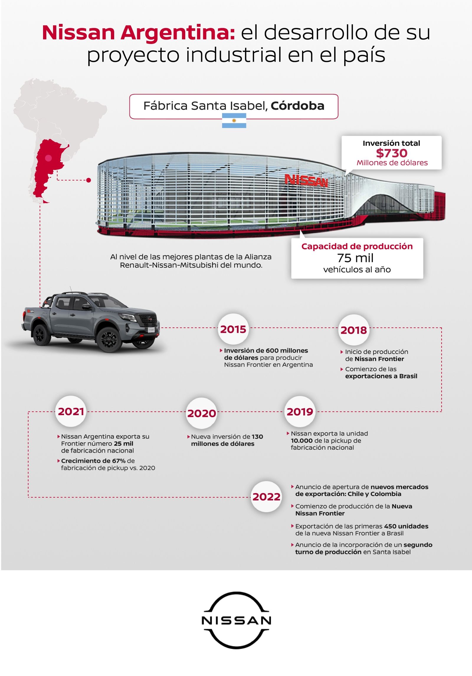 Nissan Argentina oficializó, a partir de un anuncio industrial este viernes en la fábrica Santa Isabel, en la provincia de Córdoba, que duplicará su producción anual de 25.000 a 50.000 de su vehículo Frontier y creará 550 nuevos puestos de trabajo, de manera de atender no solo el crecimiento de la demanda local, sino a los mercados de exportación, donde irá nada menos que el 60% de los producido.