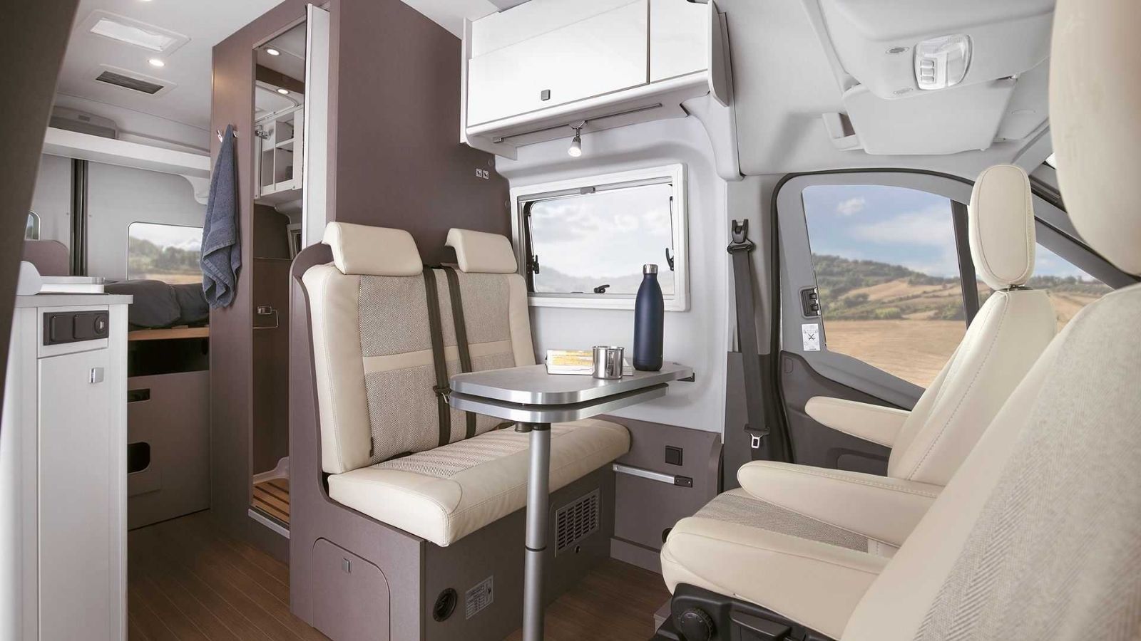 La CV 600 DF 4x4 dispone de todo lo necesario para abandonar la civilización en busca de aventuras. Los asientos delanteros pueden girarse 360°, cuenta con baño completo, cocina, y una sala de estar que incluye múltiples lugares para almacenar objetos. A eso se complementa la cama de dos plazas con una pequeña mesita. También hay una alternativa con techo elevado que aumenta la cantidad de espacio para guardar elementos varios.