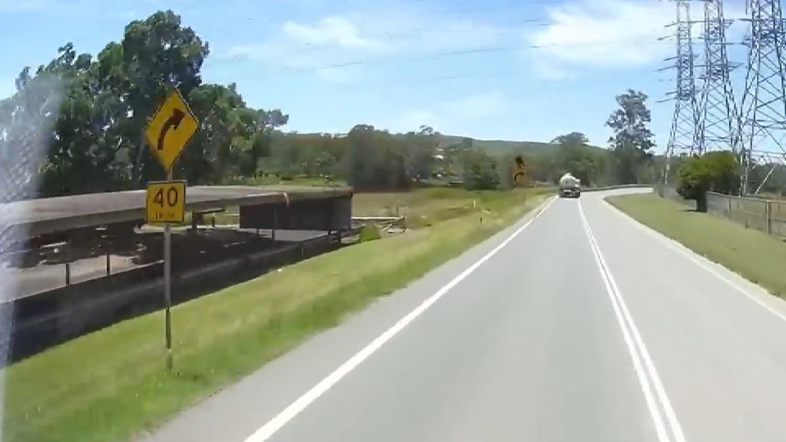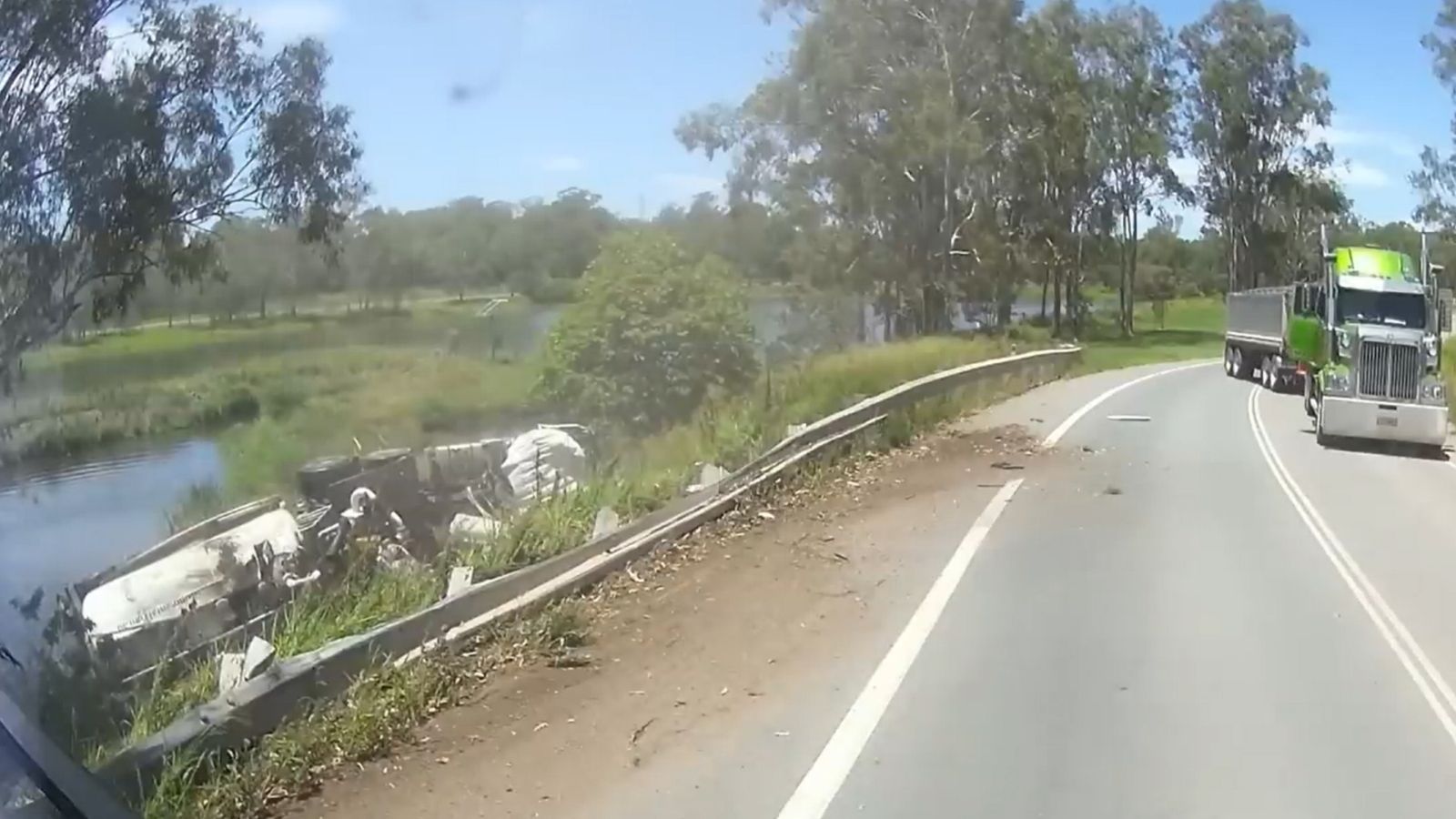 El hecho ocurrió en una ruta del Estado australiano de Queensland, donde momentos previos al siniestro se puede ver una señal de tránsito que advierte la posibilidad de vuelco de vehículos de gran porte, por lo que se recomienda circular en una velocidad máxima de 40 km/h.