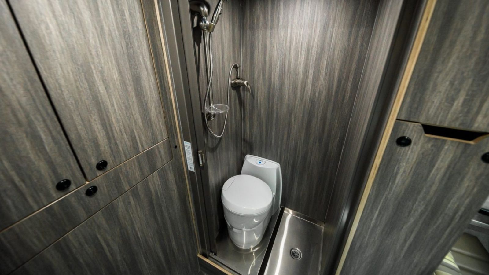El baño incluye ducha y baño de acero inoxidable con puerta corredera, inodoro de compostaje, eliminación de residuos de baños exteriores y calentador de agua 12V y 14 litros.