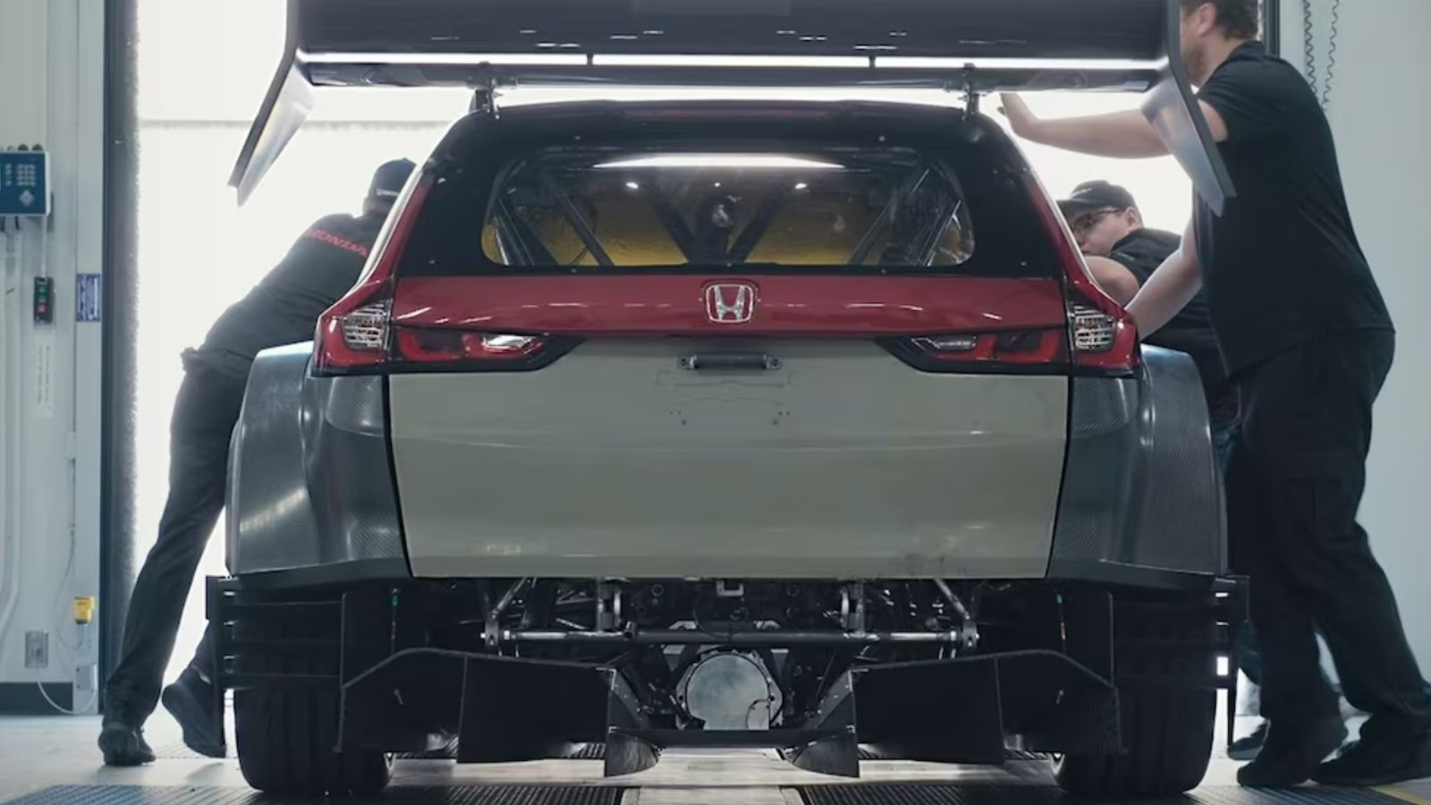 Al ver las imágenes de este particular deportivo es entendible que más de uno se pregunte qué fue lo que quedó original del SUV. Según la automotriz, desde la línea media hacia arriba es todo carrocería propia del CR-V de serie, como por ejemplo el parabrisas delantero, en tanto que de la cintura para abajo es todo fibra de carbono.