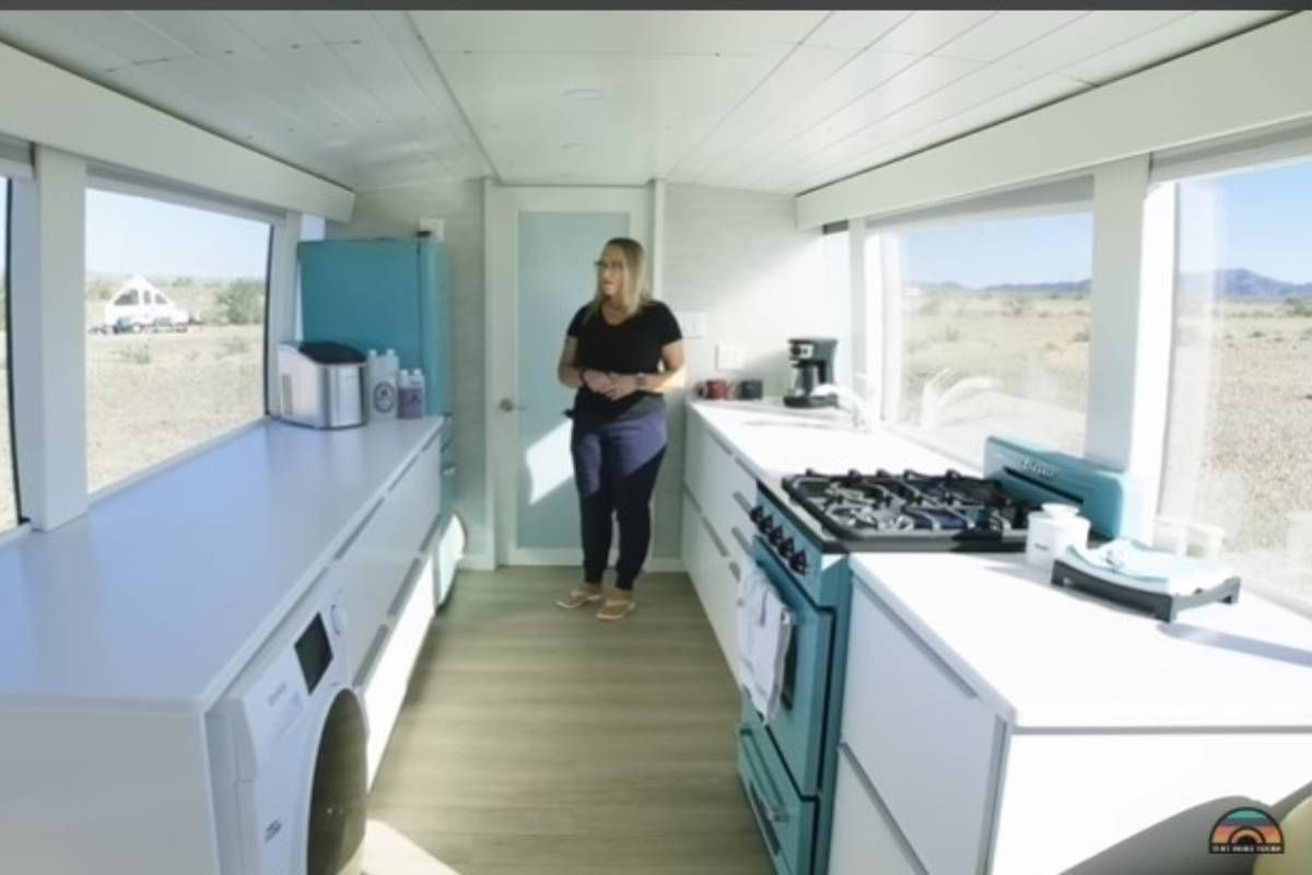 A pesar de su tamaño, la pareja que vive en este motorhome ha logrado hacer un uso eficiente del espacio disponible. Cocinan con frecuencia en el exterior y apenas utilizan la cocina con cuatro hornallas que se encuentra en una de las mesas principales. La heladera principal es pequeña, pero hay una segunda en los espacios de almacenamiento debajo. Los cajones de la cocina son lo suficientemente profundos como para guardar elementos esenciales de manera ordenada y los armarios y estantes proporcionan espacio adicional para ropa y otros artículos personales.