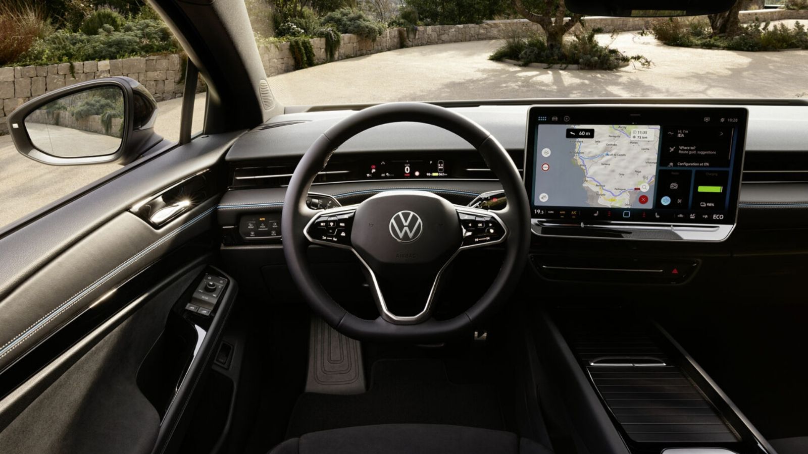 La larga distancia entre ejes permiten que en el habitáculo se goce de un gran espacio, en donde se puede encontrar una pantalla del sistema de información y entretenimiento de 15 pulgadas, head-up display de realidad aumentada, aire acondicionado integrado en el nivel superior del sistema de infoentretenimiento, control deslizante táctil retroiluminado, techo corredizo panorámico con vidrio inteligente, Climatronic de asiento adaptativo, con refrigeración o calefacción según sea necesario y también una función de secado, entre otros detalles.