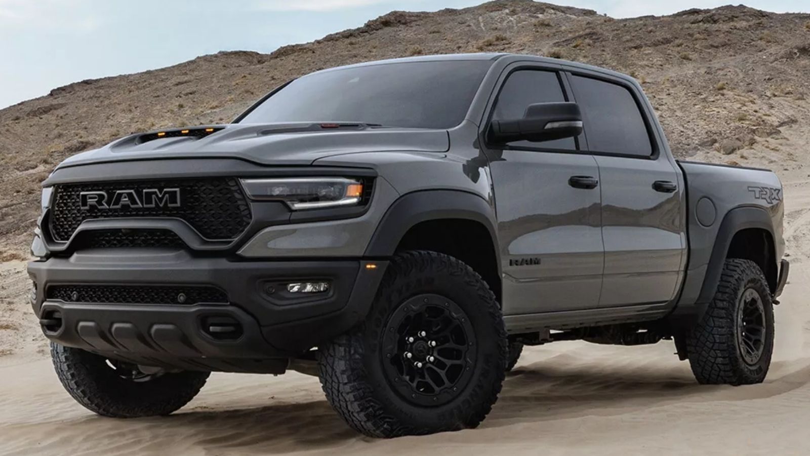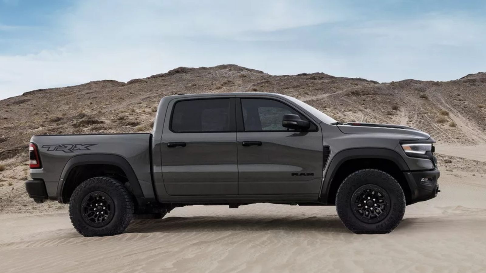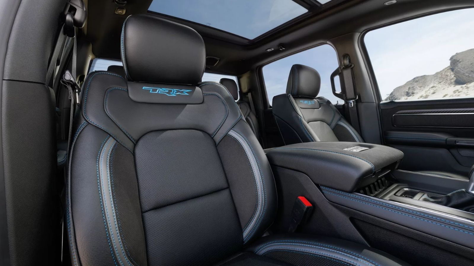 Algunos detalles que incorpora la 1500 TRX son un exclusivo color exterior Ceramic Grey, gráficos TRX en el capó y la plataforma, ruedas negras de 18 pulgadas con talón de bloqueo, techo corredizo panorámico de doble panel y revestimiento de la plataforma rociado, amarres de carga, estribo de cama y una luz de freno LED montada en la cabina.