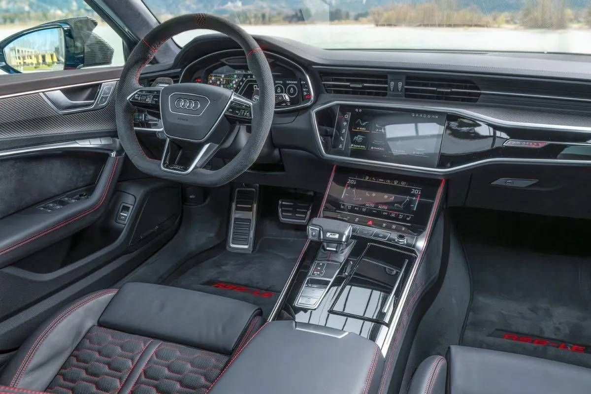 En el interior del Audi RS6 Avant, el lujo y la deportividad se combinan para ofrecer una experiencia única. Los paneles de las puertas están revestidos con material ligero, mientras que los asientos están tapizados en un elegante cuero negro con un patrón muy distintivo. El volante cuenta con la parte inferior del aro achatada y está forrado en Nappa. Además, el vehículo cuenta con costuras de contraste de color rojo y el logo del preparador en los apoyacabezas.