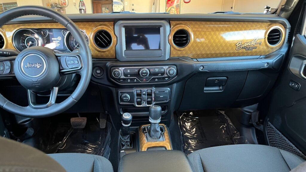 Por otro lado, el interior del Jeep Gladiator Custom Bandit Edition también ha sido modificado para darle un toque exclusivo. El tablero presenta un acabado en color dorado, que se extiende alrededor de la palanca de cambios y otras áreas del habitáculo. Los apoyacabezas también tienen bordados el logotipo "Bandit", lo que le da un toque personalizado al entorno de los ocupantes.