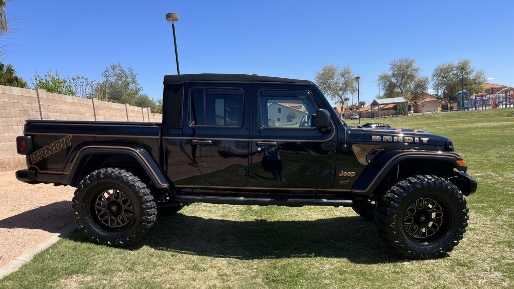 El emblema está terminado en un tono bronce, lo que le da un aspecto único y atractivo. La camioneta también cuenta con detalles en bronce en las luces antinibela delanteras, las líneas de pintura sobre los guardabarros y las puertas, y los logotipos de Jeep en bronce. Además, presenta gráficos en el capó y los paneles traseros con el nombre "Bandit", que es una clara referencia a la película "Smokey and the Bandit" protagonizada por Burt Reynolds.
