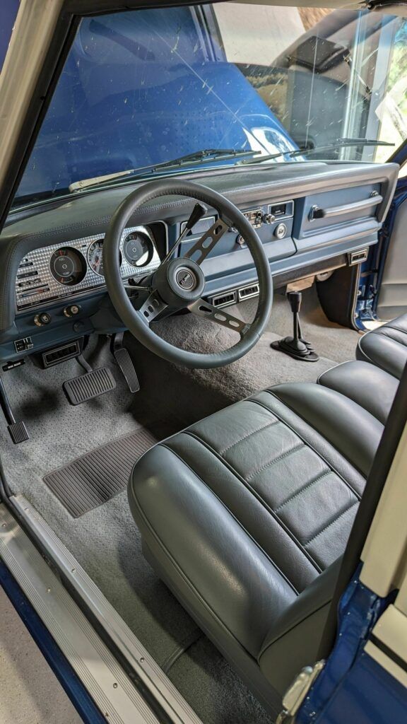 Siguiendo con la apariencia exterior, este Jeep Cherokee S luce un tono de azul” medianoche”. A diferencia de otros Jeep de esa época, esta unidad no tiene ese típico revestimiento de madera en los laterales, sino que en este caso incorpora una franja de color blanco que le confiere un aspecto diferente.