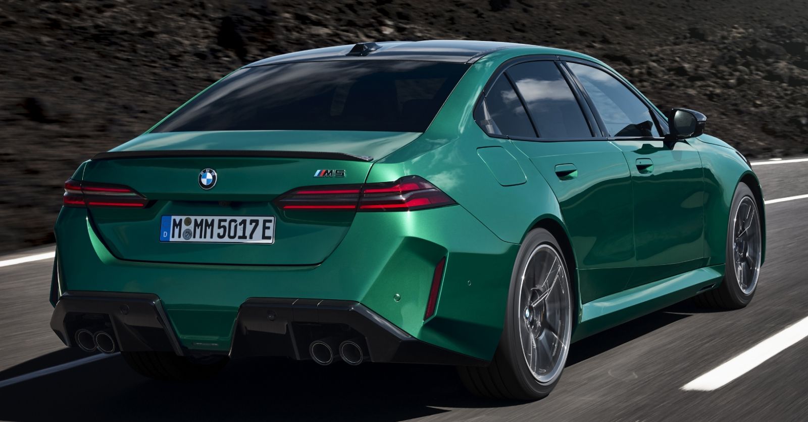 El diseño exterior, enriquecido con elementos específicos de M, acentúan el carácter multifacético del nuevo BMW M5. Las prominentes extensiones de los pasos de rueda y los faldones laterales, el faldón delantero escultural y la superficie específica del modelo alrededor del pilar C, incluido un logotipo "M5" en relieve para el pliegue de Hofmeister, le dan al modelo una apariencia atlética que lo diferencia claramente del BMW Serie 5 Sedán.