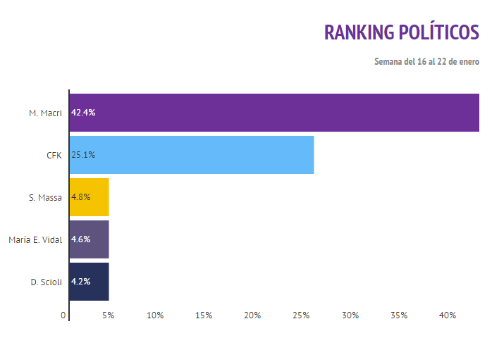 El presidente concitó la atención del 42,4% de la audiencia en las redes sociales y blogs, mientras que la expresidenta Cristina Fernández de Kirchner se llevó uyn 25,1%. Sergio Massa los sigue de lejos, con el 4,8% y María Eugenia Vidal con el 4,6%. El último es Daniel Scioli, con 4,2%.