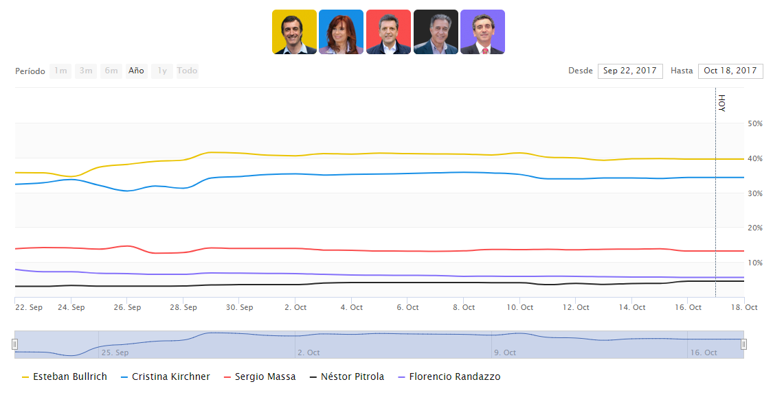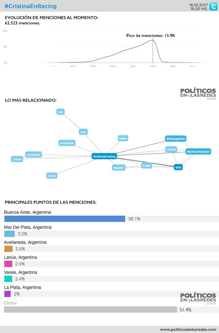 Según el portal politicosenlasredes.com y su cuenta de Twitter, @BocaDeRedes, el corte de menciones en esa última red social a las 16.20, en pleno acto de cierre de campaña en Racing de Cristina Fernández de Kirchner arrojó un total de 62.523 menciones en Twitter.