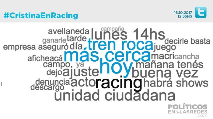Las menciones al acto encontraron además de voces convocantes, otras que se quejaban por la interrupción del ramal ferroviario del Roca, que la militancia tildó de "a propósito" y copó la red. Este es el globo de palabras usadas a la hora de hablar de #CristinaEnRacing: