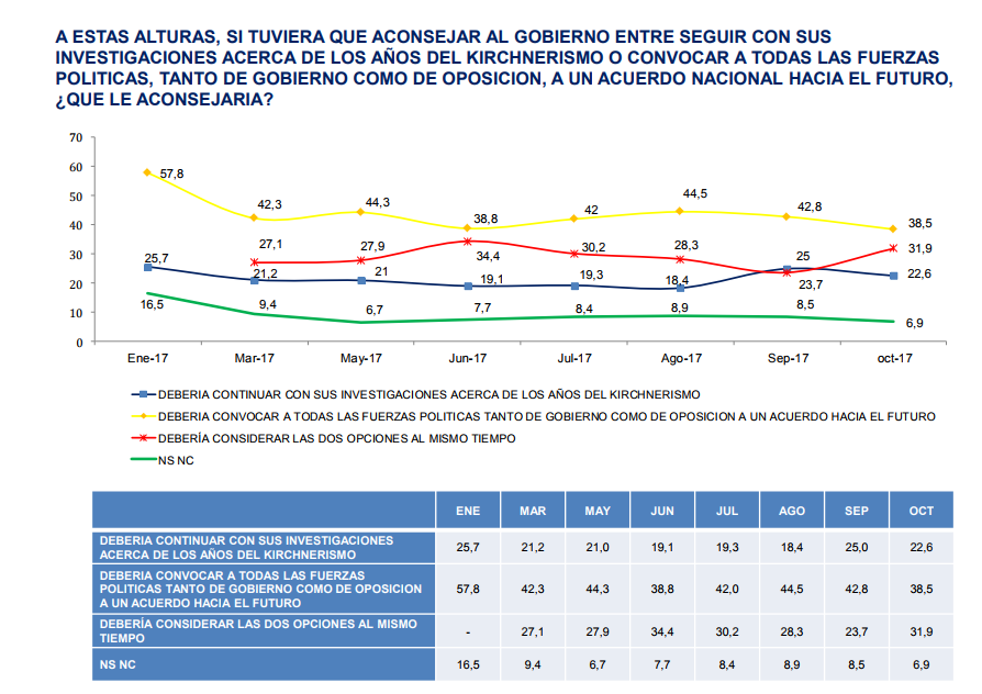 En la puja, está otra: "debería continuar con las investigaciones acerca de los años del kirchnerismo". Esta opción cosechó 22,6% de los apoyos.