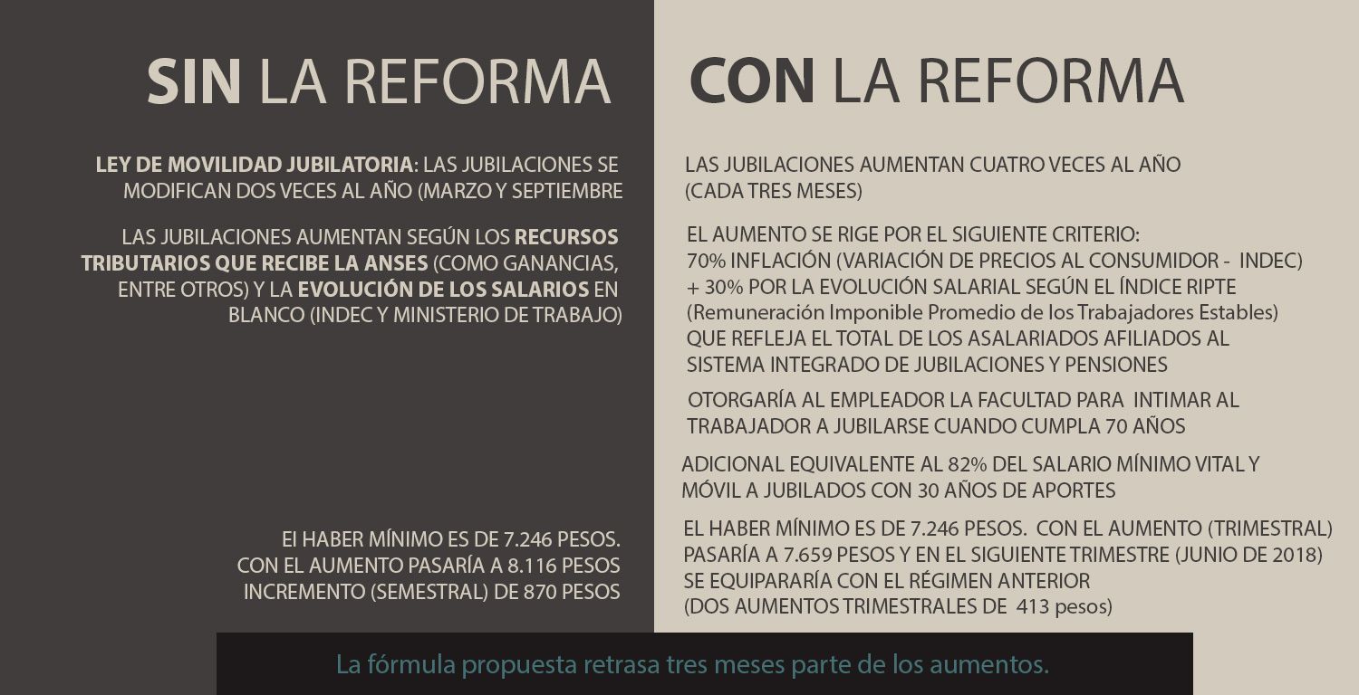Para el próximo año, inflación de 16,6% y 22% de aumento para las jubilaciones y pensiones: de allí surge una diferencia salarial de 5,4% a favor de estos últimos. Es el argumento del que se vale el presidente Macri para sostener el éxito de la reforma previsional, según afirmó hace pocas horas, cuando fue entrevistado por Alejandro Fantino: "El año que viene (los jubilados) van a cobrar más. Las jubilaciones van a crecer entre 4 y 6 por ciento más que la inflación. Y el otro año, de vuelta. Y el otro año, de vuelta", aseguró el mandatario..