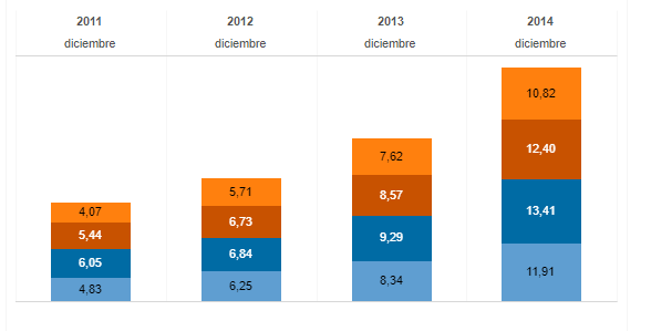 Este cálculo sí da otro resultado tomando como referencia la inflación anual de los años 2012, 2013 y 2014 (IPC Congreso): 25,6%, 28,3% y 38,53%, respectivamente). La suma da 92,43%. En diciembre de 2014, el litro de súper costaba $11,91 y tres años atrás (diciembre de 2011), $4,83. En este caso, el litro de súper no solo duplicó su valor, sin o que aumentó 147%