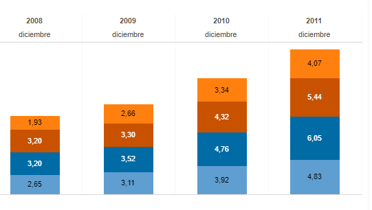 Y la diferencia entre diciembre de 2011 ($4,83) respecto del valor del litro de súper tres años atrás ($2,65 en diciembre de 2008), es $2,18.