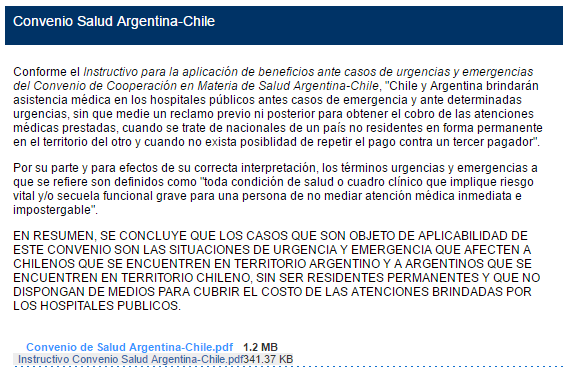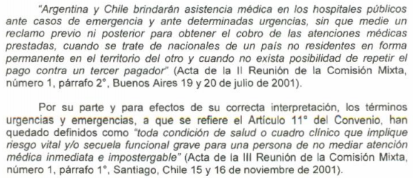 El Consulado General de la República Argentina en Valparaíso (con jurisdicción sobre las regiones de Valparaíso y Coquimbo), explica en la web del Ministerio de Relaciones Exteriores y Cultos que aún rige el Convenio de Cooperación en Materia de Salud entre Argentina y Chile (1996) y su instructivo (2010) que "consagran la gratuidad de la atención médica que, en caso de urgencias y emergencias reciban los turistas argentinos en hospitales públicos y siempre que los afectados no dispongan de medios económicos suficientes ni un seguro médico u obra social que le brinde cobertura por tales gastos en Chile". Y aclara que de serle requerido algún pago a los turistas argentinos que reciban atención médica de urgencia en tales condiciones, se sugiere comunicarse inmediatamente al Consulado.