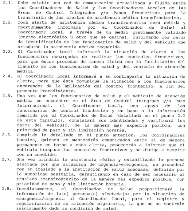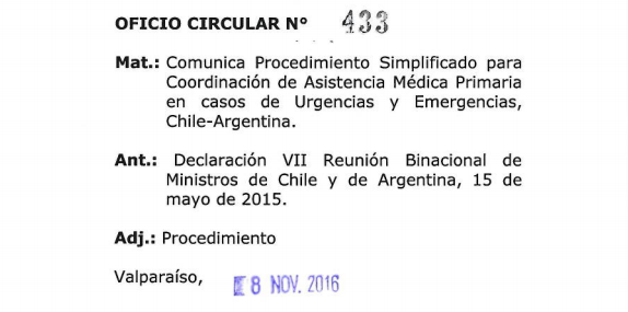 El 15 de mayo de 2015, Argentina y Chile acordaron un procedimiento "simplificado" para la asistencia médica primaria en casos de urgencias y emergencias en las zonas de control fronterizo para así "contribuir a brindar la facilitación de tránsito en los pasos internacionales" (ver abajo). El procedimiento para llevarlo a cabo se difundió en noviembre último. En el punto 2.5 hace mención al "vehículo de atención médica" (ambulancia) en la zona de frontera para atender no sólo urgencias, sino también emergencias, lo que significa que no debe pasar más de una hora para que el paciente sea asistido.